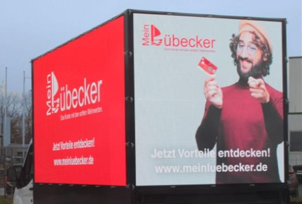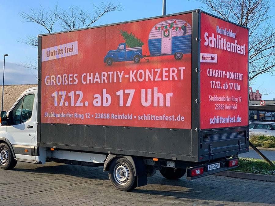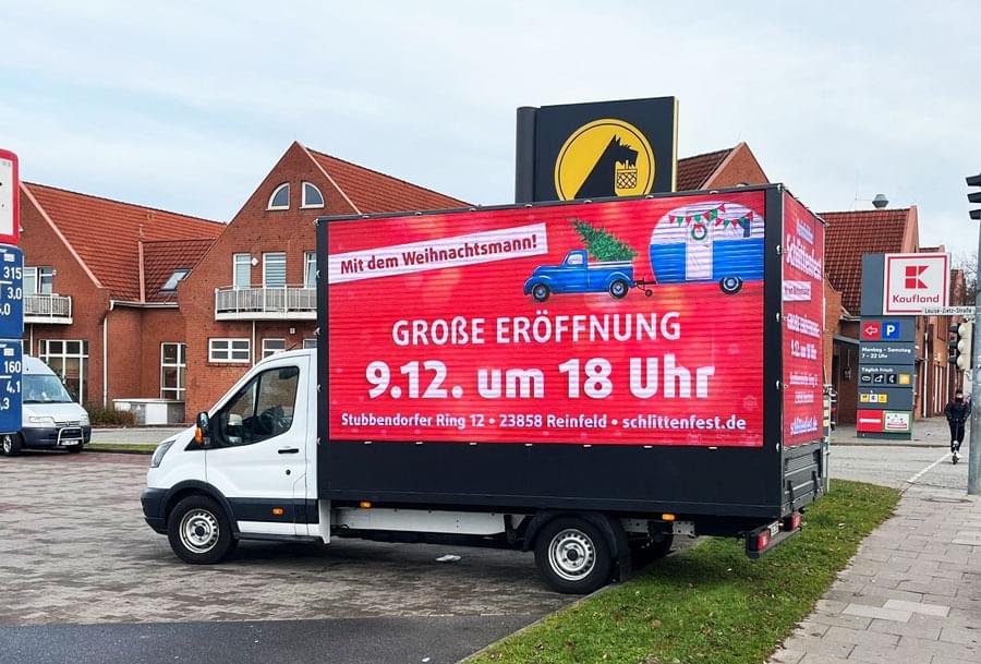 Zur Eröffnung von Auto & Freizeit Nord GmbH im Dezember 2022 in Reinfeld wurde auf dem Gelände vom Nordeuropas größtem Caravan- und Reisemobil-Zentrums ein Weihnachtsmarkt aufgebaut, der an den Wochenenden für Besucher aus dem Umland geöffnet hatte. Damit wurde das „Reinfelder Schlittenfest“ ins Leben gerufen und möglichst viele Menschen sollten von dem Weihnachtsmarkt erfahren. Als Agentur haben wir für die Eröffnung und den Weihnachtsmarkt die Vermarktung übernommen. Neben klassischen Großformatplakaten, Anzeigen in Tageszeitungen, Postwurfsendungen und einer Social Media Kampagne kam an zwei Tagen der LED-Truck von SG Medientechnik zum Einsatz. Die gesamte Planung inkl. Zeit- und Routenplanung klappte sehr gut und auch die Angaben für die Aufbereitung und Anlieferung der Daten zur Bespielung der LED-Flächen waren perfekt.