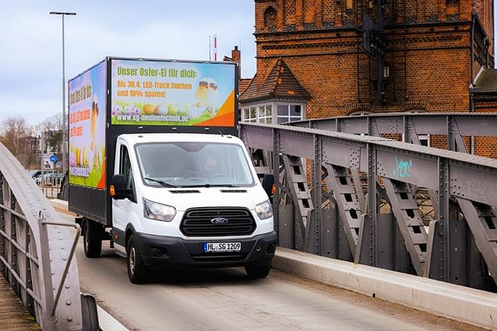 Unser LED-Truck ist mit deiner Botschaft auf Wunsch 24/7 im Einsatz. Das heißt: Hohe Reichweite, garantierte Kundennähe und ständige Verfügbarkeit. Und das mit geringerem persönlichen Zeitaufwand.